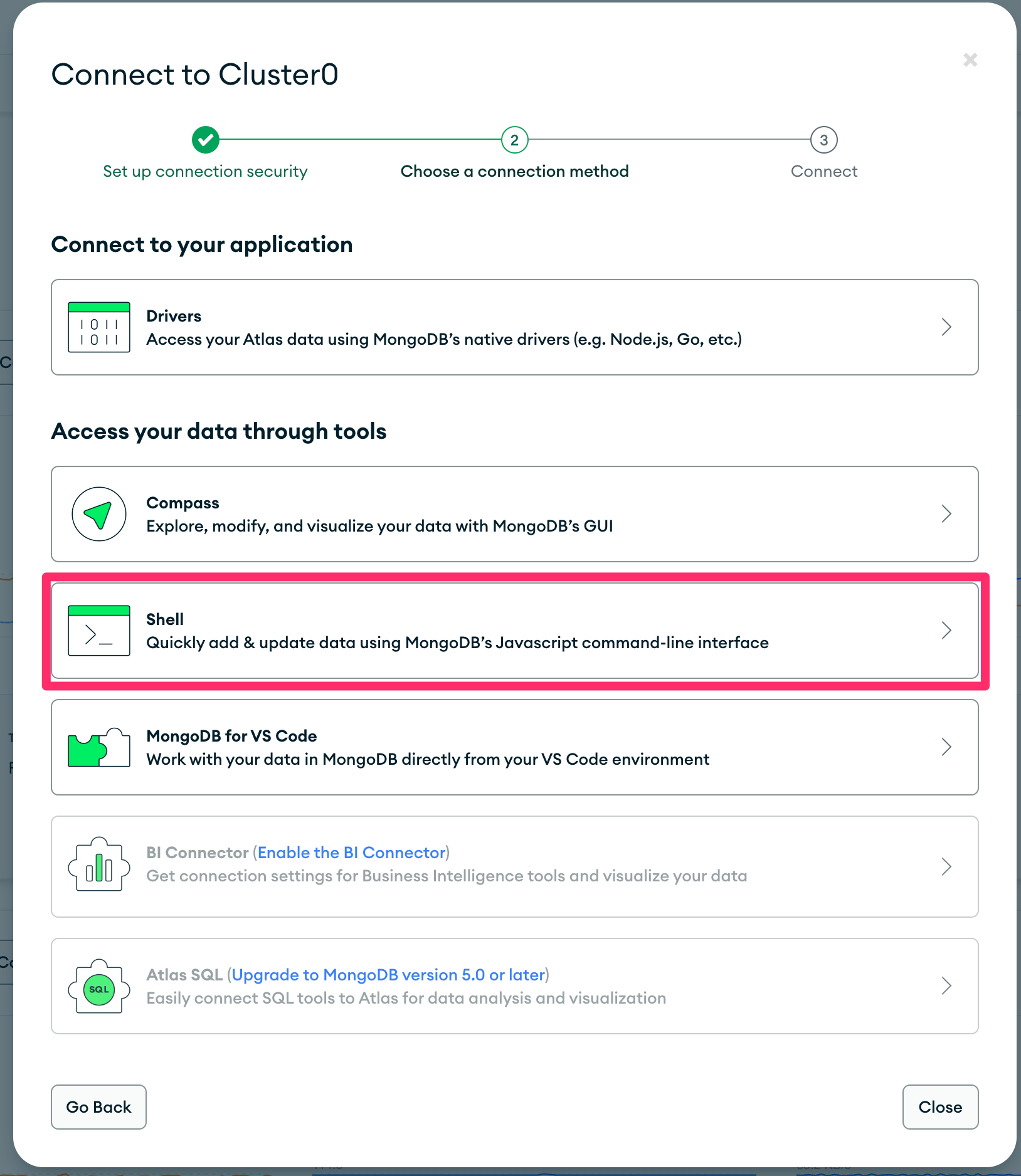 1. On the "Connect to <cluster name>" modal dialog, select "Shell" under the "Access your data through tools" section.
