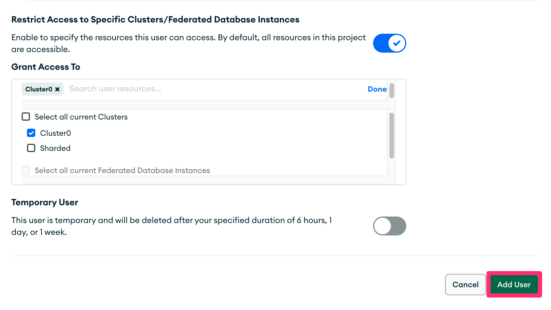 These steps create a dedicated, read-only user for replicating data. Alternatively, you can use an existing MongoDB user with access to the database.